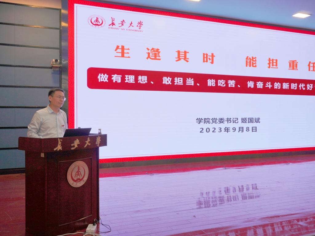 典礼结束后,姬国斌以“生逢其时 能担重任,做有理想、敢担当、能吃苦、肯奋斗的新时代好青年”为新生讲授开学第一课。他围绕“我们的时代”“我们的大学”“我们的责任”三个方面,指出新时代是快速发展、需要人才、大有可为的时代,青年学生拥有建功立业的广阔平台。他介绍了学校的发展历程成就,讲解杰出校友爱国奉献、创新奋斗的先进事迹,深刻解读新时代大学生的责任使命。他对全体新生寄予殷切希望,希望他们做有理想信念追求、有担当作为闯劲、有吃苦耐劳精神、做有团结奋斗品质的大学生,在m88APP官网学有所成、研有所进,挺膺担当、矢志奋斗,做堪当民族复兴重任的时代新人。