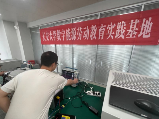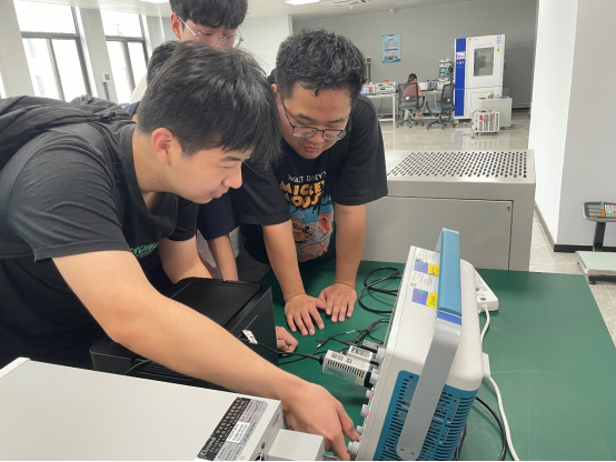 本次劳动教育实践活动针对“便携储能电源原理、应用及外特性测试”分小组展开,实践内容包括产品认知、理论学习与实操实践三部分。产品认知是由讲解员通过实物展示向学生逐一讲解立讯精密科技(西安)有限公司的便携式储能电源相关产品,让学生对便携式储能电源市场有了系统化认知;理论学习则是由一线工程师向学生讲解便携式储能电源的基本原理,包括系统架构及各模块主要作用,其基本理论涉及电路、电力电子技术、单片机等电气工程专业课程核心知识。学生在听取讲解的过程中也对专业课程有了进一步的认识、理解与加深。实操实践是本次是本次劳动教育实践活动的重头戏。在工程师的指导下,学生分析户外电源产品的性能测试要求,明确测试仪器选型、安装及安放。继而,分别针对环境温度承受能力测试、外观结构测试、机械性能测试、抗电磁干扰能力测试、用电安全保护测试等各项测试需求,学生亲自动手,操作专业测试设备,完成相关的测试内容。例如,利用最新型的示波器,测量在不同的负载条件下户外电源的输出伏安特性等。