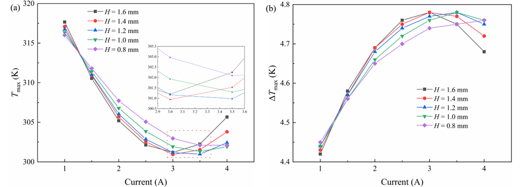 不同TEC热电腿高度和输入电流对电池最大温度和温差的影响