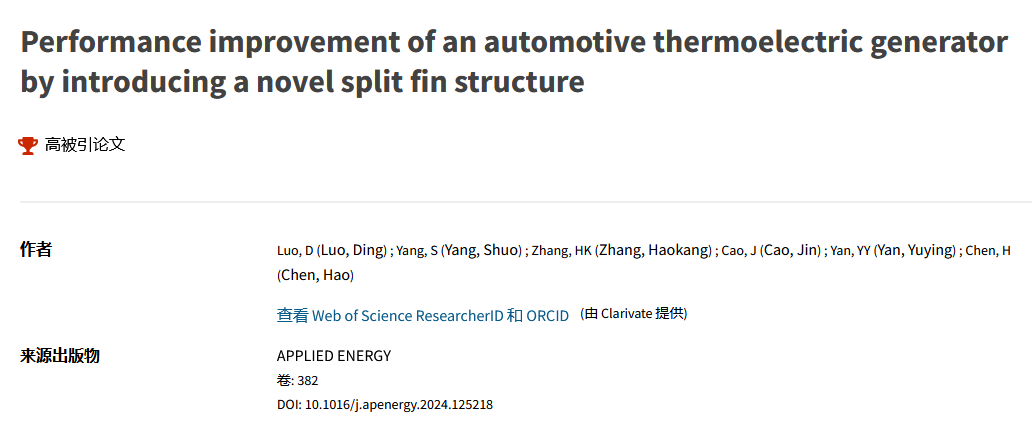 m88APP官网m88APP官网罗丁副教授以第一作者身份发表在《Applied energy》上的题为《Performance improvement of an automotive thermoelectric generator by introducing a novel split fin structure》的研究论文,入选ESI高被引论文,被引频次排名前1%,该论文正式发表于2025年3月,目前被引用28次。