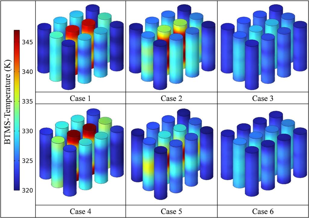 为满足锂离子电池在高温环境下对高效散热的需求,研究团队提出了一种结合热电制冷器(TEC)、相变材料(PCM)与热管(HP)的混合型电池热管理系统(BTMS)。通过建立CFD扩展的多物理场数值模型,团队系统分析了该系统的热管理性能。研究结果表明,PCM-HP-TEC混合BTMS在多个配置对比中表现最优,包括单一PCM系统、PCM与HP组合系统、液冷(LC)与PCM组合系统,以及HP-PCM-LC混合系统。热管的数量与布置方式、相变材料的特性以及TEC输入电流被证实是影响系统热性能的关键因素。适当增加热管数量、提高TEC输入电流及相变材料中膨胀石墨的质量分数,有助于降低电池最高温度、减少PCM液相分数,并延长温控时间。然而,热管数量的增加需兼顾布置合理性,过高的TEC电流则会削弱温度均匀性。在热管布置为Case 6结构、TEC输入电流1.25 A、膨胀石墨质量分数12%的相变材料条件下,该系统展现出最佳热性能:最高温度299.2 K,最大温差3.46 K。该研究为提升高温工况下锂离子电池的热管理水平提供了新思路与理论依据,对开发高性能BTMS具有积极推进作用。