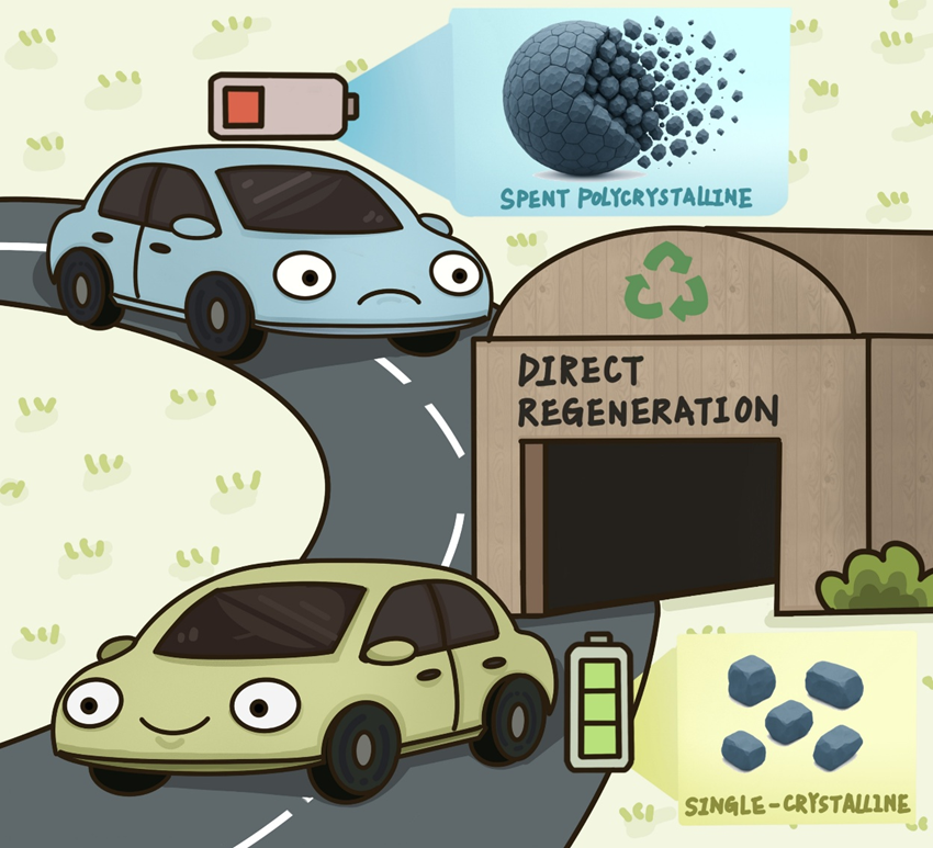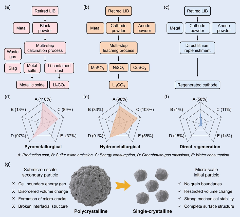 直接再生技术相比传统方法实现了技术上的创新,该技术无需将正极材料拆解为元素或前驱体,通过精准补锂与低温处理,即可原位修复退役正极的晶体结构缺陷,保留原有微观形态。而单晶正极(SC-NCM)结构设计为提升再生材料性能提供了关键解决方案。商用多晶正极(PC-NCM)因晶界错位、应力集中,在充放电循环中易产生微裂纹与电解质侵蚀,导致性能衰减。而单晶正极凭借其消除晶界的本征优势有效破解上述难题。