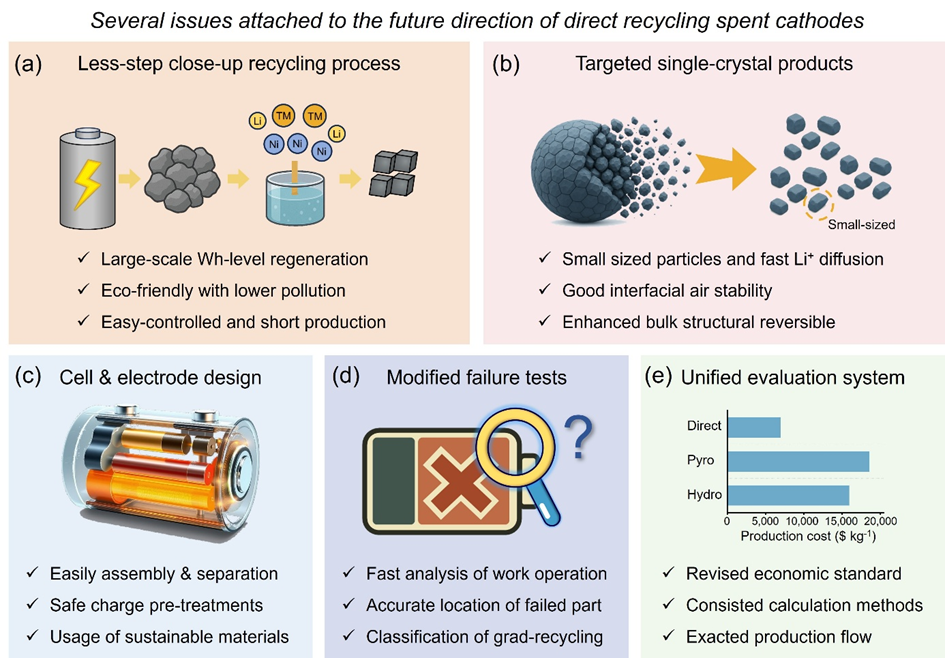 图4 直接单晶再生的未来发展方向存在几个问题。(a)少步骤的近距离直接回收过程,(b)有针对性的再生单晶产品,(c)电池和电极结构设计,(d)修改的故障测量,以及(e)统一的评估系统。