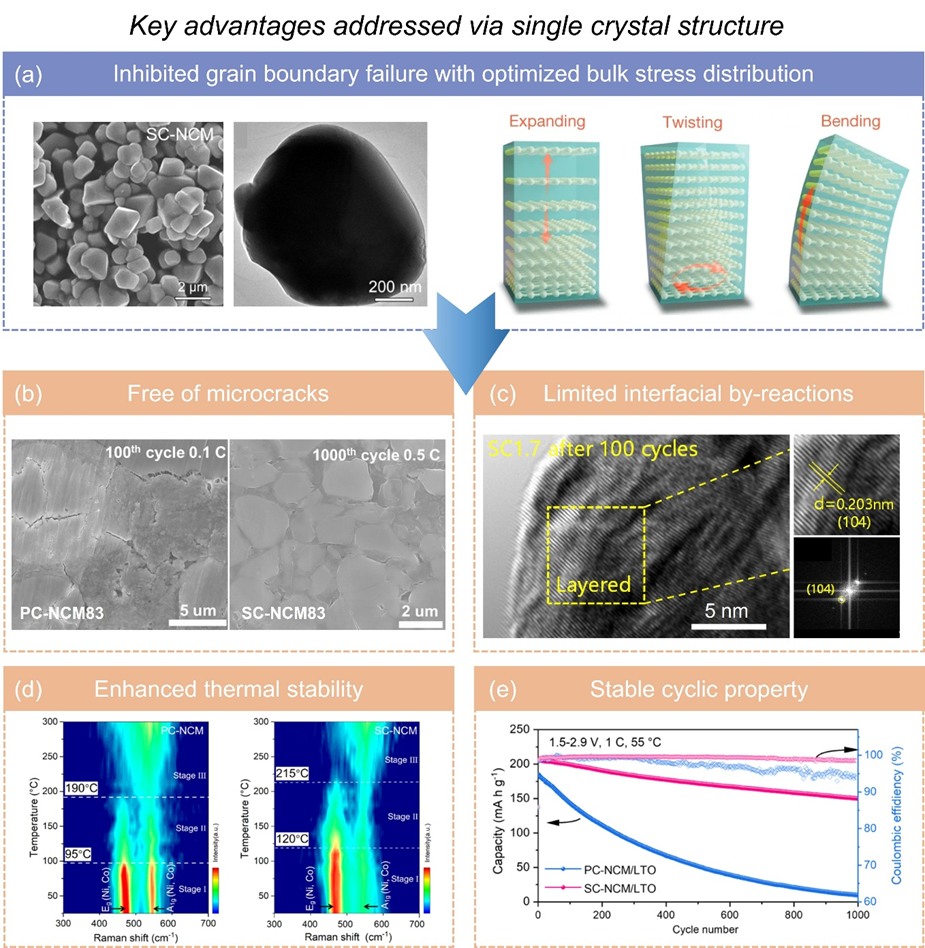 图3 单晶正极材料所具备的关键优势。(a)单晶正极材料的微观形貌及高结构可逆性示意图,以及其各项优势:(b)无微裂纹、(c)界面副反应少、(d)热稳定性提升,以及(e)循环性能稳定。