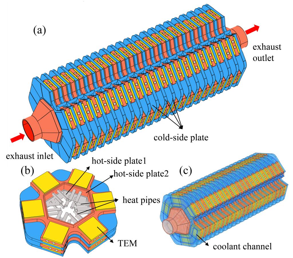 本研究针对热电发电机在汽车尾气余热回收中存在的输出功率低和体积庞大等问题,创新性地提出了一种集成热管的堆叠式汽车热电发电机(HPATEG)结构。同时基于一种结合计算流体动力学模型和热电耦合模型的预测方法,系统分析了HPATEG的工作性能。结果表明,通过使用热管和堆叠设计,各热电模块(TEM)的两端产生了显著的温差,实现了大量的电能生成。然而,从第一层TEM到最后一层,温度和输出功率有所下降。更多地,HPATEG的输出性能受到排气温度和流量变化的影响。当流量为600 g/s、温度为700 K时,最佳发电功率可达1510.73 W,但TEMs的互联拓扑连接会产生明显能量损耗,特别是对于具有众多TEM的系统。通过设计优化,研究团队所提出的最佳TEM拓扑连接结构分为4个单元,每个单元分别包含9/10/11/12层TEM,单元内串联,单元间并联,其功率输出可达1406.91 W,比传统的串联拓扑结构提高12%,达到最佳输出功率的93%。本研究为开发高性能HPATEG提供了新的设计思路和理论支撑。