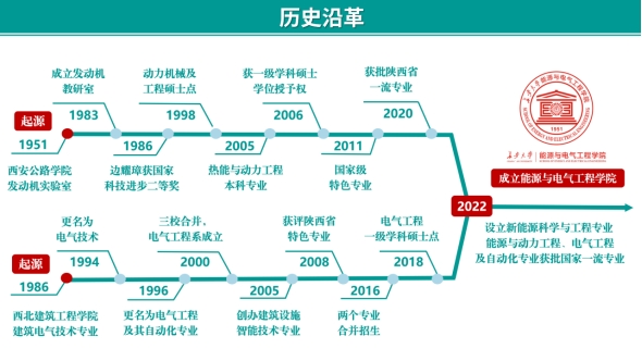 动力工程及工程热物理学科的前身可追溯至1951年西北交通学校成立的发动机实验室,电气工程学科可追溯至1977年西安公路学院设立的电机与电器专业,以及1987年西北建筑工程学院开设的建筑电气技术专业,2005年增设了建筑设施智能技术专业。学科根脉深远,底蕴深厚。