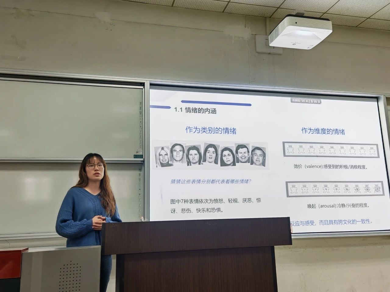 随后,程老师由浅入深,由点到面,由“游戏”引出情绪的概念,讲解时又深入浅出,用简洁明了的语言清晰地为同学们阐释了每位心理学家的专业理论。老师还结合前人实验数据,又从生活中引材,将情绪的内涵本质、情绪的表达、对压力的理解娓娓道来。