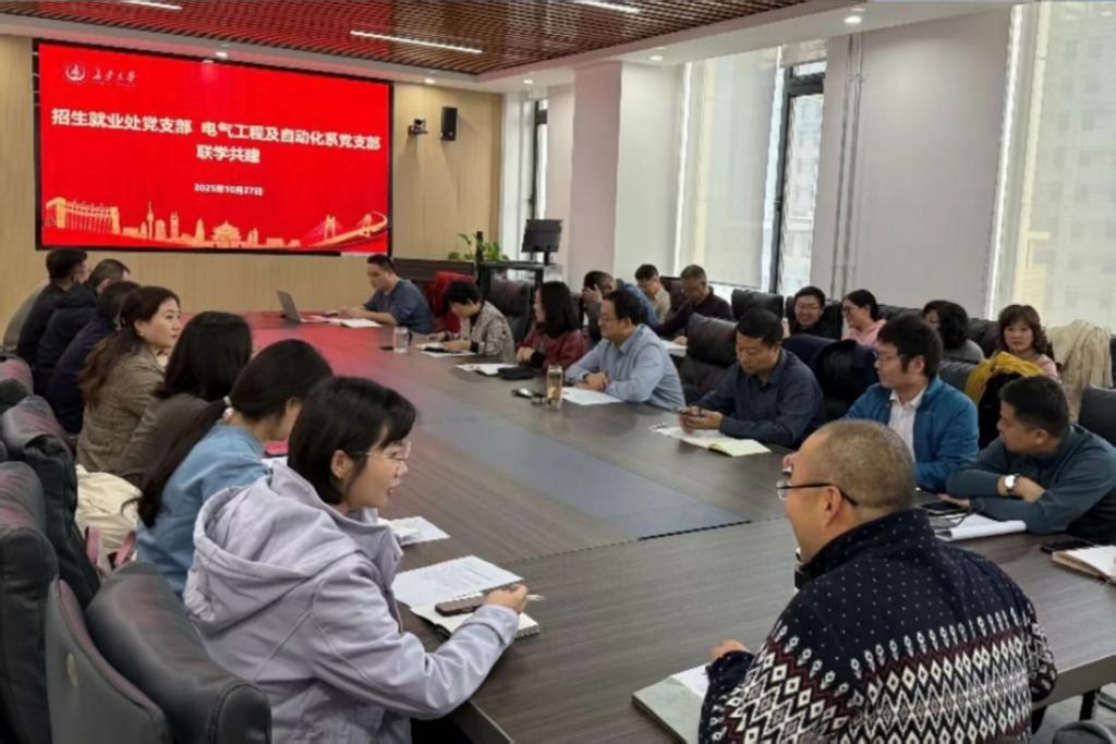 10月27日,电气工程及其自动化系党支部与招生就业处党支部在学院603会议室开展联学共建活动。招生就业处处长邓红章,副处长赵磊、王翀,学院党委书记王艳,副书记、副院长、纪委书记倪凤英,副院长徐先峰,以及双方党支部30余位教职工党员参加了本次活动。