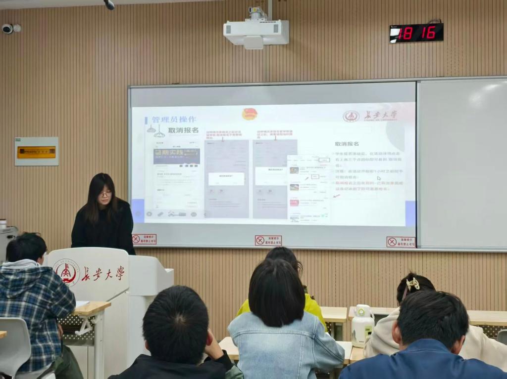 青年思想教育中心实践部负责人王淑颢对“青春长大”平台的注册与各年级课外实践课程的分数要求进行了讲解,展示了活动参与方法与诚信值相关注意事项,同时强调了对团日活动的主题确定、组织策划、考核评优等方面的相关事宜。