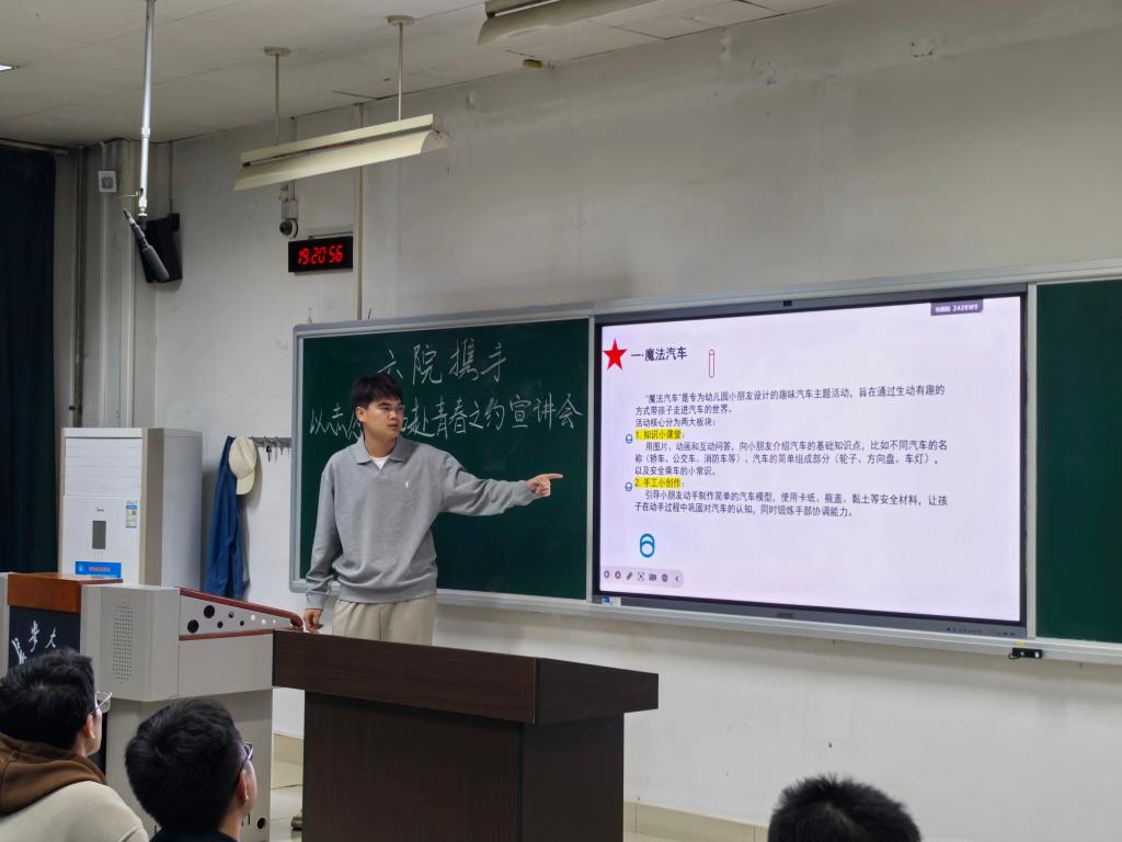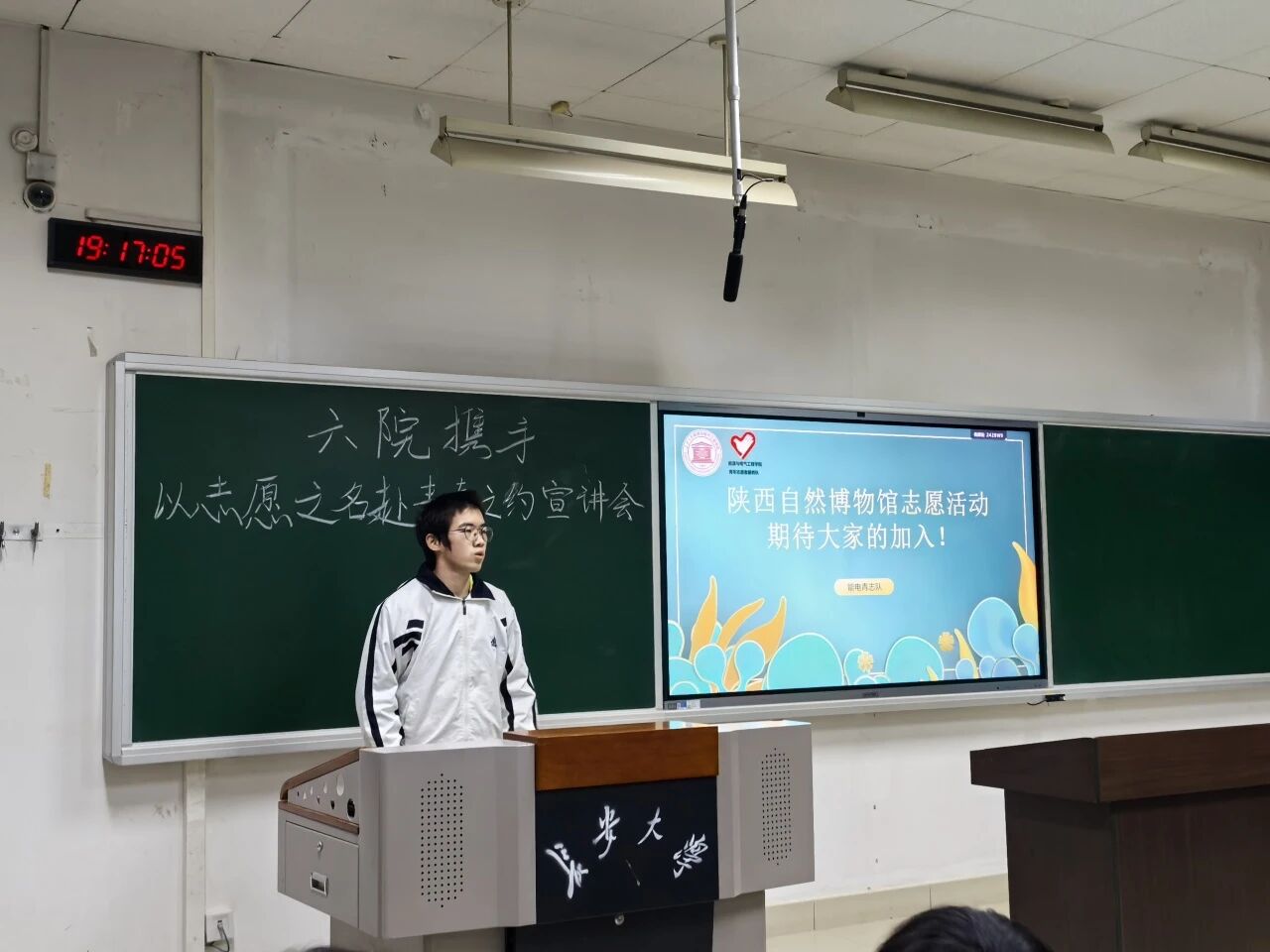 能电青志主席凌人钊为大家介绍了能电青志的常驻活动——陕西自然博物馆志愿活动,从场馆概况、行程安排到具体工作内容均作了详细说明,使同学们对活动有了全面了解。他的介绍旨在吸引更多同学加入能电青年志愿者行列,共同弘扬“奉献、友爱、互助、进步”的志愿服务精神,在这项光荣的事业中挥洒青春,携手推动志愿服务事业不断向前发展。