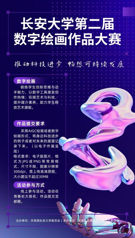 为深入学习宣传贯彻习近平新时代中国特色社会主义思想,营造浓厚的校园创新创业文化氛围,人文学院科协特此举办“推动科技进步,畅想可持续发展”m88APP官网第二届数字绘画大赛。在当今世界,可持续发展已经成为全球关注的焦点。同时,科技创新是推动社会进步和可持续发展的重要驱动力。我们可以采取不同的形式将身边的例子和对未来的展望记录下来,本次活动分为两个赛道“数字绘画”和“AIGC绘画”,用数字绘画和AIGC技术来记录科技带给自己和身边其他人和事的变化以及对未来的展望。旨在以多种多样的形式让大家更加直观地感受到科技创新对可持续发展带来的变化和贡献,深刻体会到科技强大的力量。同学们可以在青春长大报名后,以群聊或邮箱的方式收集参与者的作品,并在公众号上发表展示。在活动结束后,我们将给参与者发放获奖证明。