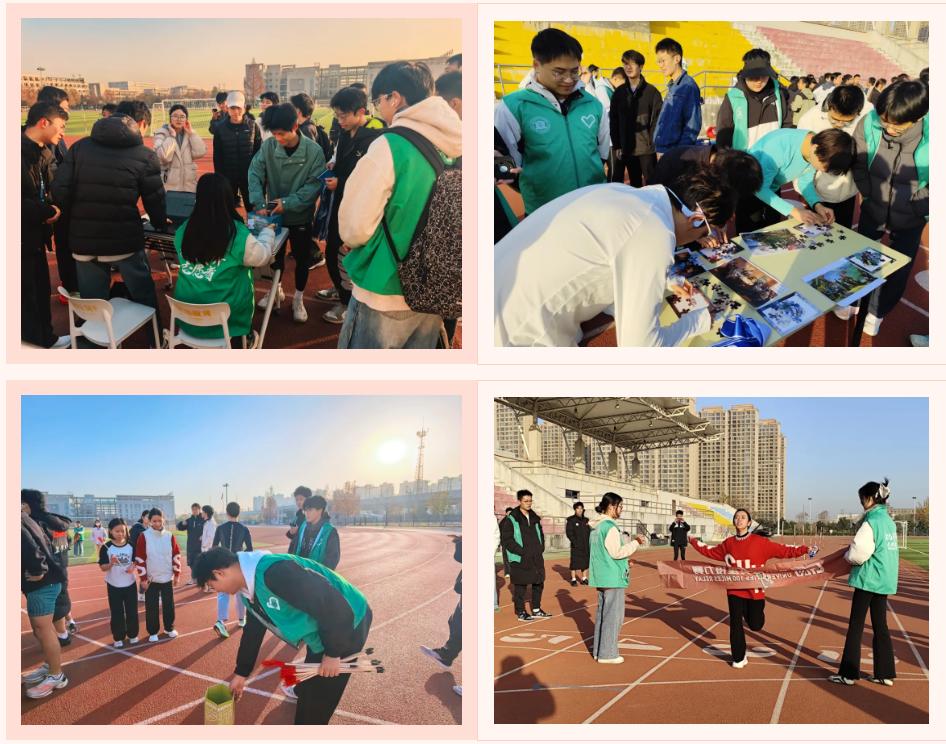 从清晨七点半开始,能电青志队的志愿者们便已全员到岗,有条不紊地开展物资分发、队伍引导、赛前检录等工作。他们身着统一志愿服装,精神饱满、笑容温暖,成为赛场边最动人的风景。在检录点,他们认真工作,为选手提供及时帮助;在挑战区,志愿者耐心讲解规则、维护秩序;在接力区,他们精准计时、协助交接。无论是引导参赛者完成“S型绕杆跑”,还是协助拼图任务、组织投壶挑战,志愿者们始终以专业、热情的服务,保障了赛事的有序进行,赢得了选手和老师的一致赞誉。