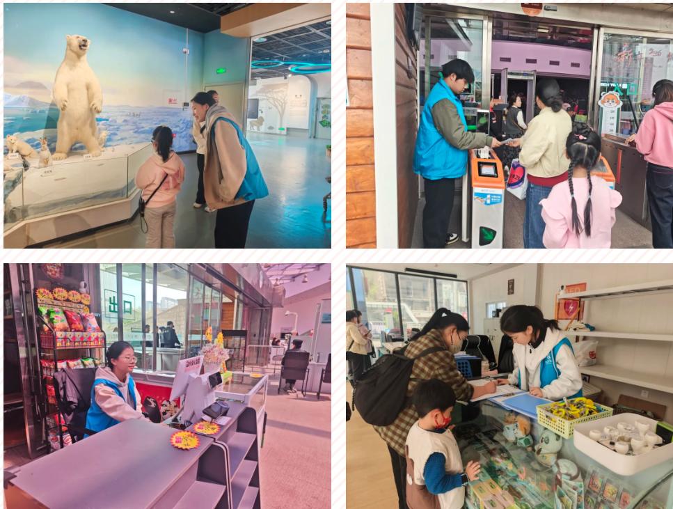 清晨的阳光洒进博物馆大厅,志愿者们便已集结完毕,完成岗前培训与岗位分工后,迅速奔赴各自服务点位。检票口前,他们主动引导游客扫码核验、维持入场秩序,让人流流转更顺畅;展馆步道中,他们俯身讲解展品知识、提醒文明观展,为好奇的孩子与家长耐心答疑;服务台旁,他们细致登记咨询信息、协助处理突发需求,用温和的态度化解每一份焦急。从极地标本展区的驻足讲解,到文创商店的收银协助,志愿者们的身影穿梭在展厅各处,用点滴行动践行着雷锋精神的时代内涵。