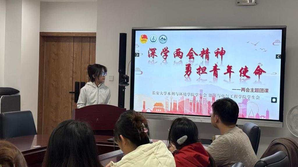 活动伊始,由水环学院学生会执行主席张欣怡带领全体参会人员共同学习2026年全国两会精神,重点围绕“国家‘十五五’规划”、智能经济与数字转型、新质生产力发展、青年就业创业等热点内容展开深入解读。