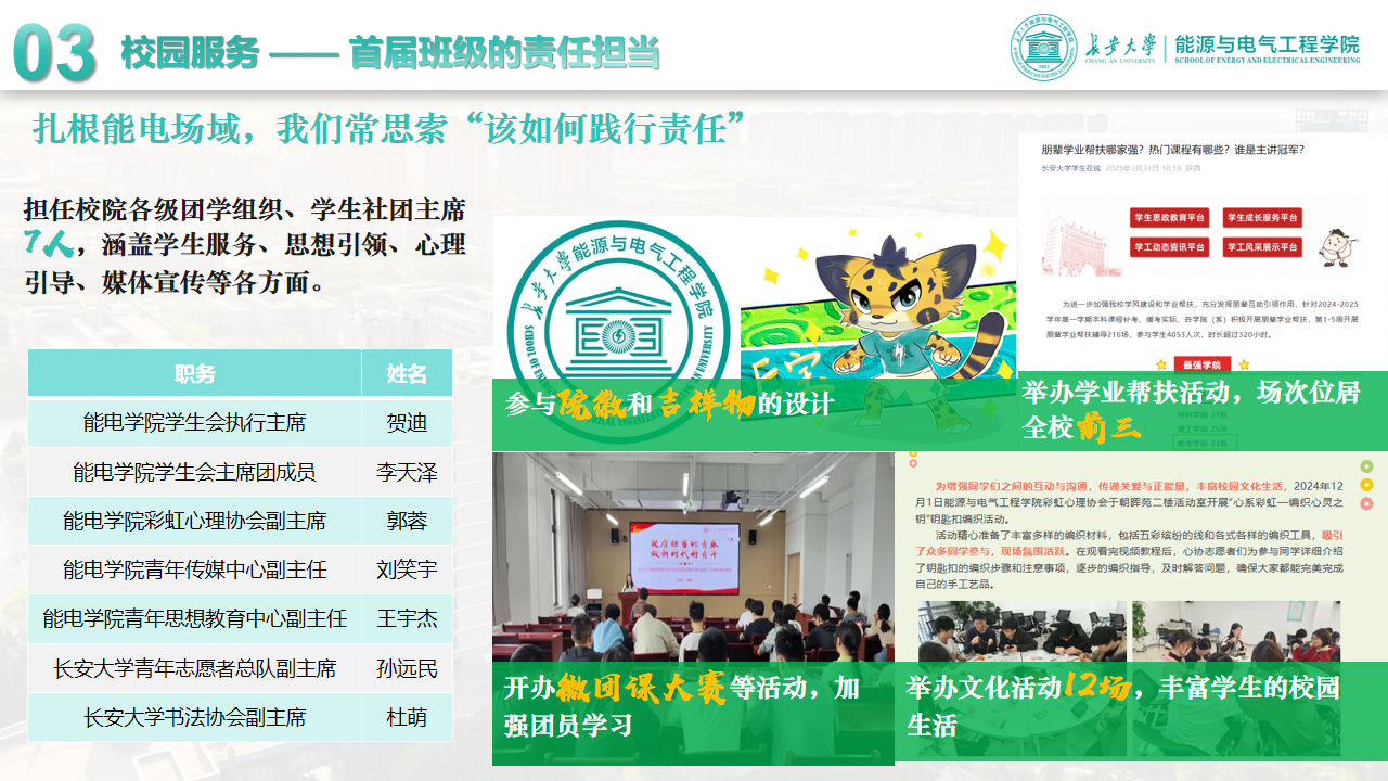 班级将个人成长融入集体与社会,让责任担当成为青春底色。班内7人担任校院各级团学组织、学生社团主席及核心骨干,覆盖思想教育、媒体宣传、心理健康等领域,策划微团课大赛、设计院徽吉祥物、组织校园文化活动12场,成为学院建设的重要力量。