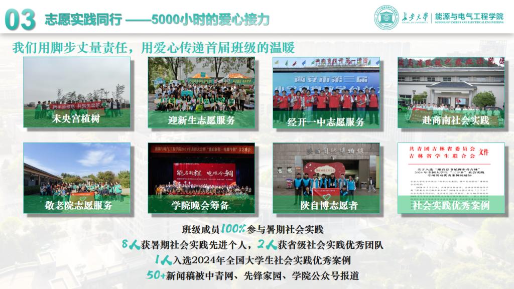志愿服务与社会实践同样亮眼。全班30人100%投身实践,从未央宫植树、敬老院慰问到商南乡村振兴,累计志愿服务超5000小时。班级获评省级优秀实践团队2项,8人获“暑期社会实践先进个人”,1人入选2024年全国大学生社会实践优秀案例,50余篇新闻稿被中青网、先锋家园等报道,让能电学子的风采在实践中闪光。