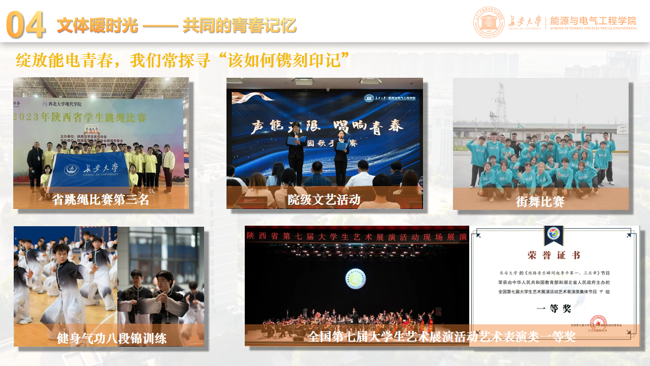在文体竞技与文艺展演中,班级学子勇攀高峰,斩获全国第七届大学生艺术展演艺术表演类一等奖、陕西省跳绳比赛第三名;在校园“渭水之星”、健身气功八段锦、街舞比赛等院级及以上文体活动中,处处可见班级成员奋勇拼搏的身影。从课堂到赛场,他们将专业知识与综合素质相融合,把集体温暖与个人成长相浸润,在每一个舞台留下奋斗足迹。