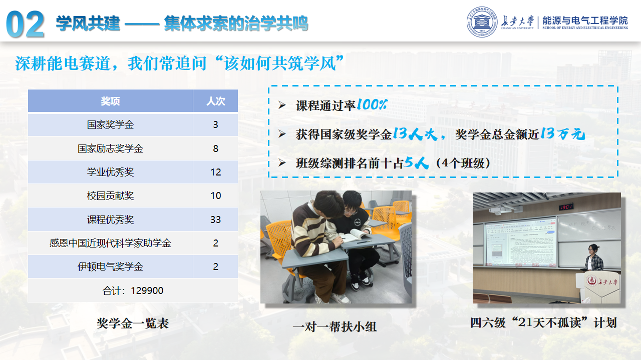 班级以“一个都不落下”为初心,构建常态化学业互助体系,课程通过率始终保持100%,综测排名全院前十中占5人,居年级前列。班级累计获得国家级奖学金13人次(其中国家奖学金3人次、国家励志奖学金8人次),总额近13万元。