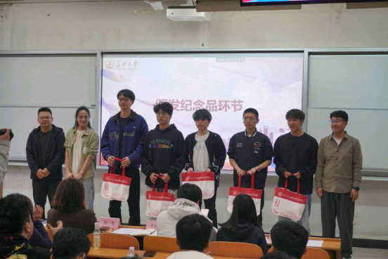 学院团委副书记于晓虎和彭阳为往届获奖的项目负责人颁发纪念品,以此表彰他们过去的辛勤付出与优异成绩,同时激励全体参赛运动员以优秀为榜样,再创辉煌。