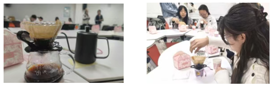 活动伊始,空气中弥漫着咖啡豆的醇香。在心协工作人员的引导下,同学们沉浸式体验手冲咖啡的每一步:研磨、控温、注水、等待……静心感受水流与咖啡粉的温柔交融。那一刻,同学们暂时放下杂念,专注于当下的每一次呼吸与动作。在醇香与静谧中,压力悄然消散,大家的身心在专注中得到舒缓与沉淀。