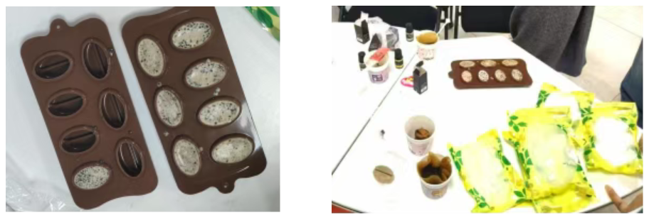 手冲之后,咖啡渣不再是废弃之物,而是化身创意手作的核心原料。同学们将咖啡渣与皂基融合,滴入心仪的香氛精油,搅拌、倒模、等待凝固——一块块独一无二的咖啡手工皂在大家手中诞生。“废弃之物也能焕发新生”一位同学感慨道。这份体验,悄然化作一种温暖的心理暗示:生活中的遗憾与低谷,如同废弃的咖啡渣,只要用心打磨、积极转化,便能重新绽放美好,解锁自我成长的力量。